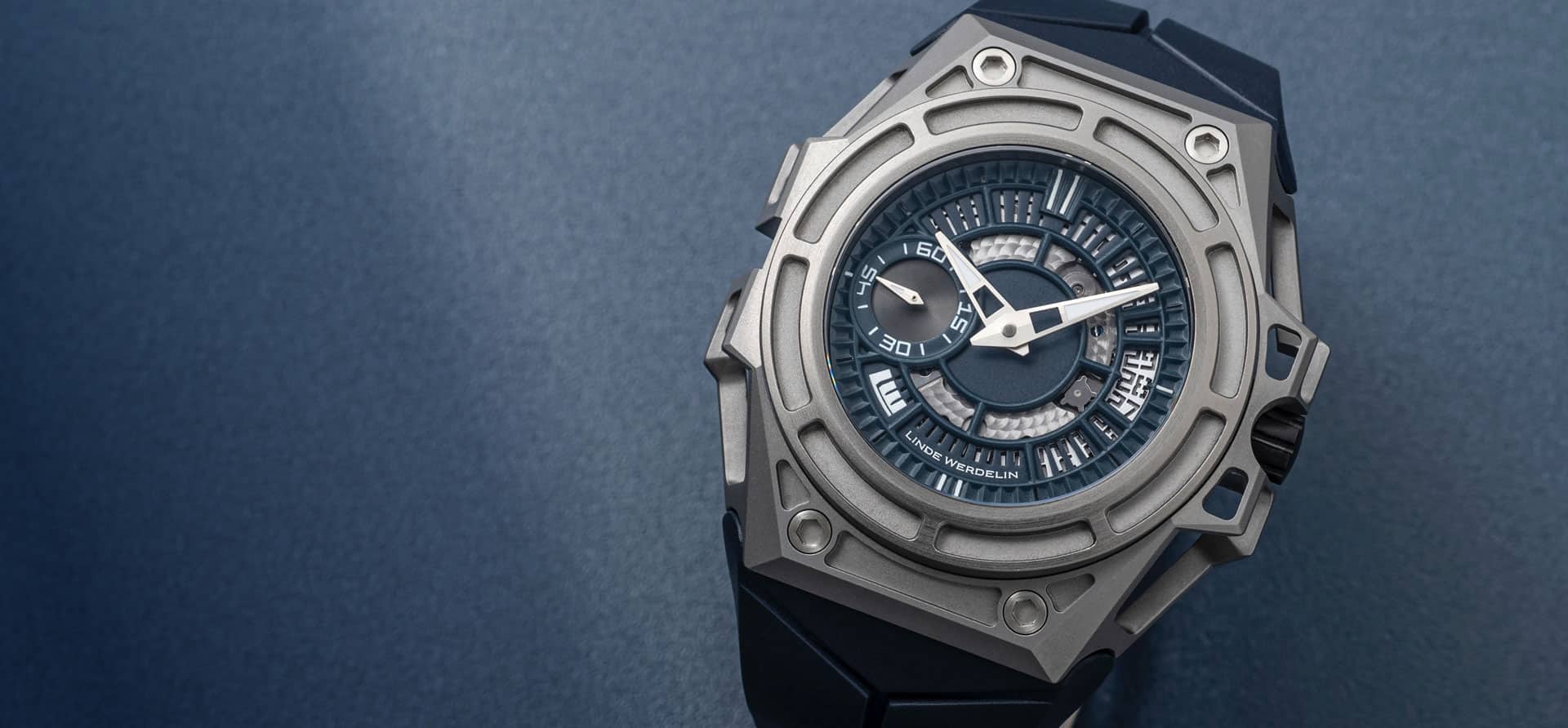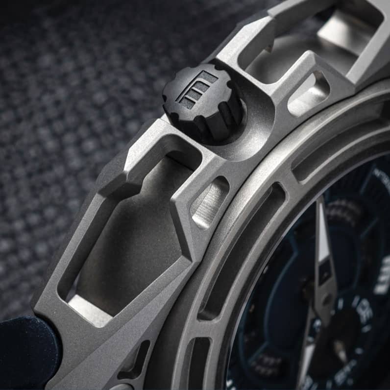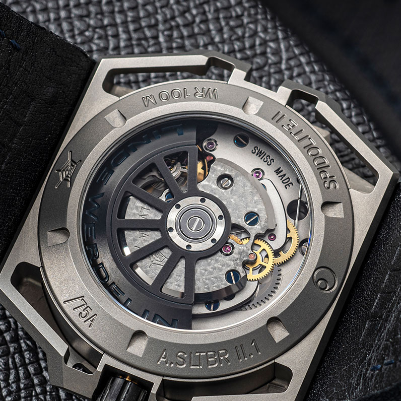 Much like the spider’s web, the Spido series is designed to be light as well as strong. The Arktis dial is paired with a blue natural rubber or textile strap. With a similar movement to the SpidoSpeed (minus the chronograph) the Concepto movement has ceramic bearings and a very strong balance wheel to make it more shock resistant and well-suited to sports. The LW Rota in black complements the black crown and the back has an intricate Spido icon reminiscent of a spiderweb. This piece offers water resistance to a depth of 100 metres.